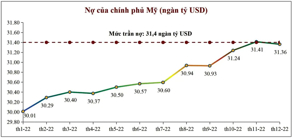 Một rủi ro chính trị quan trọng không thể bỏ qua, là vấn đề nợ công của Mỹ. Mức trần nợ công của quốc gia này hiện đang là 31.400 tỷ USD, trong khi việc nâng trần nợ công vẫn chưa được 2 đảng Dân chủ và Cộng hòa thông qua. Việc mâu thuẫn kế hoạch ngân sách giữa 2 đảng kéo dài từ cuối năm 2021 cho đến nay, đã dẫn tới mức trần nợ công không được nâng lên. Trong khi đó, nợ công của chính phủ Mỹ đã tăng liên tục kể từ đầu năm, và đã có thời điểm chạm mức trần vào cuối tháng 11. Thị trường lo ngại khi nợ công chạm trần, việc thanh toán các khoản nợ đến hạn của chính phủ Mỹ sẽ không được chi trả đúng hạn, có thể gây ra tình trạng căng thẳng thanh khoản đối với USD, làm cho giá USD quay trở lại đà tăng. Điều này rất rủi ro đối với giá hàng hóa nguyên liệu và làm gián đoạn tăng trưởng kinh tế thế giới.