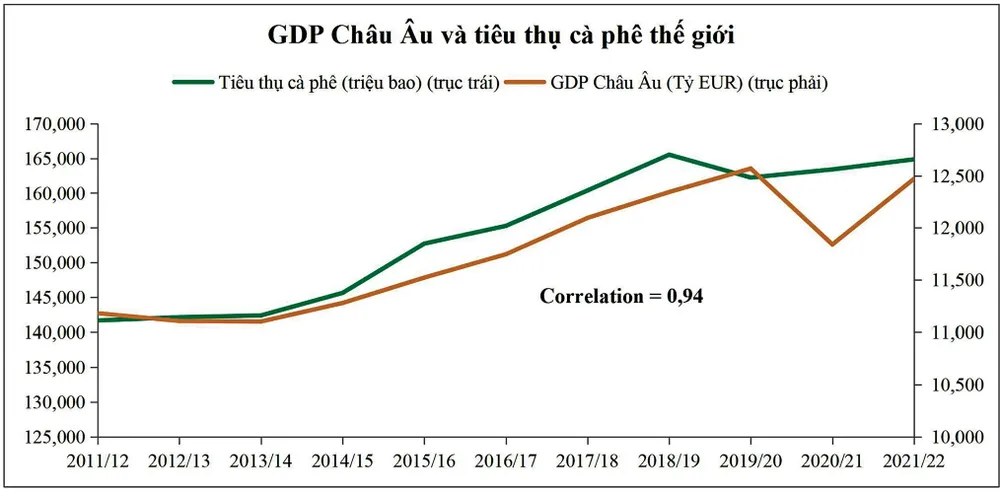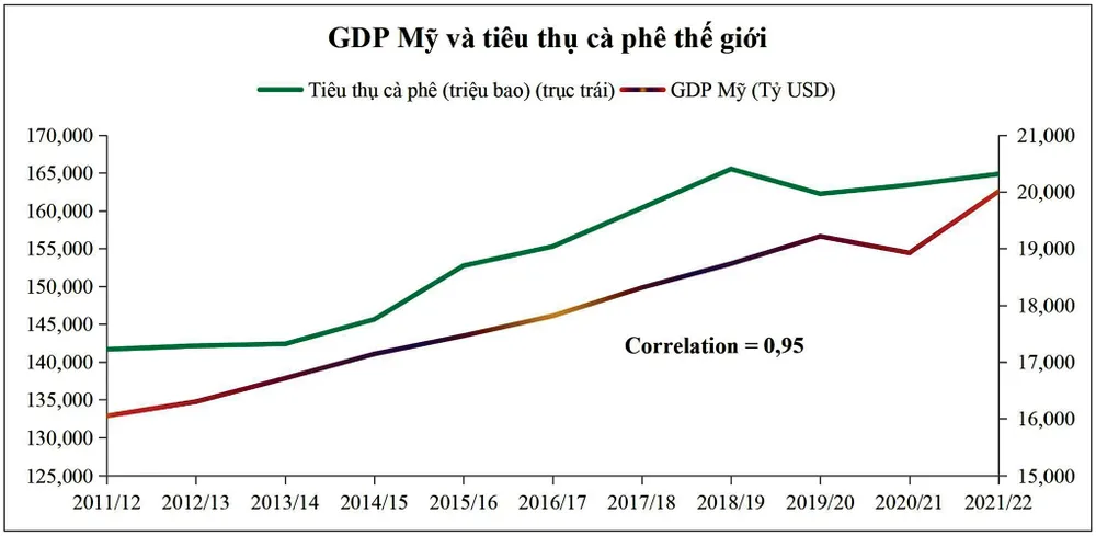 Trong khi đó, nhu cầu tiêu thụ được USDA dự báo tăng nhẹ 1,1%, đạt 167,04 triệu bao. Báo cáo cho thấy cán cân cung - cầu thặng dư khoảng 7,9 triệu bao và tồn kho cuối vụ tăng khoảng 6,3%. Tuy nhiên, điều thị trường lo ngại không chỉ dừng lại ở đó. Bởi báo cáo của USDA chỉ được các nhà giao dịch quan tâm ở khía cạnh dự báo nguồn cung, với chuyên môn khảo sát nông nghiệp. Trong khi dự báo nhu cầu là ẩn số phức tạp hơn, dẫn tới động thái trừ hao thêm đối với mức tiêu thụ theo như USDA đưa ra. Nhu cầu tiêu thụ cà phê có sự tương quan thuận cao với GDP của 2 khu vực kinh tế lớn là Mỹ và châu Âu, với hệ số correlation lần lượt 0,95 và 0,94.