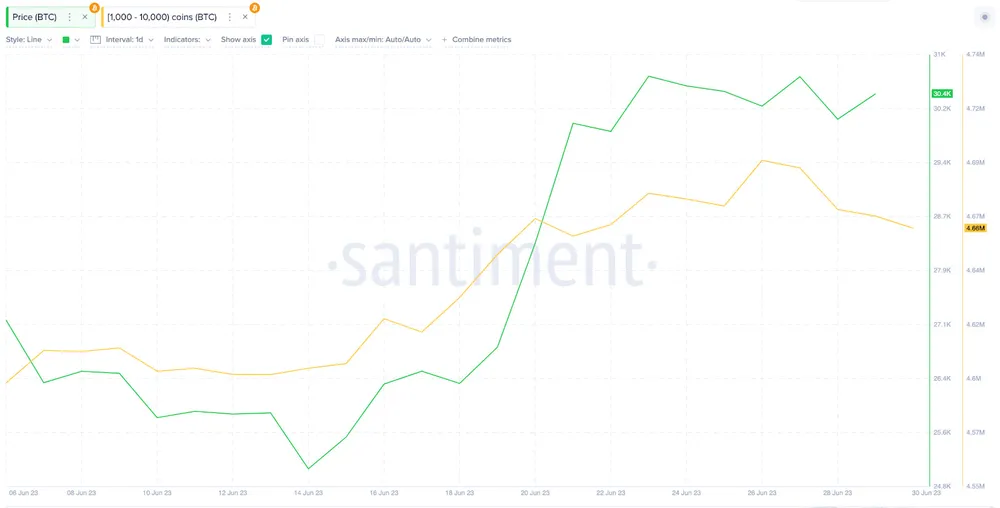 Mối quan tâm ngày càng tăng đối với các công cụ phái sinh BTC giữa các nhà đầu tư tổ chức đã bắt đầu phát triển theo nhu cầu ngày càng tăng đối với Bitcoin. Theo dữ liệu on-chain, một nhóm cá voi am hiểu về giá nắm giữ số dư từ 1.000 BTC đến 10.000 BTC đã bắt đầu mua vào khoảng ngày 15-6.