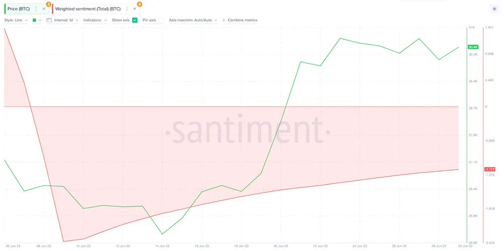 Biểu đồ Santiment bên dưới cho thấy Tâm lý có trọng số BTC vẫn ở mức -1 mặc dù giá tăng gần đây.
