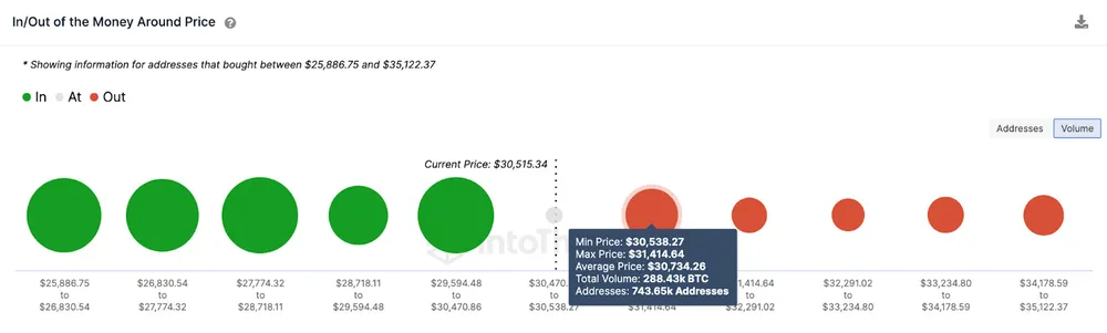 Như được hiển thị bên dưới, một nhóm gồm 744.000 nhà đầu tư có 288.000 BTC ở mức giá trung bình là 30.700 USD có thể làm chậm đà tăng.
