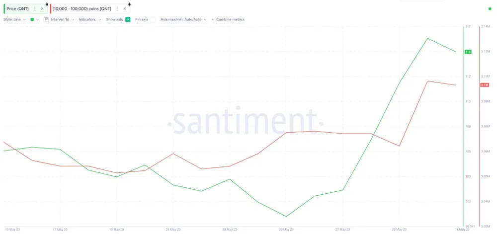 Cụ thể, cụm cá voi nắm giữ số dư từ 10.000 đến 100.000 QNT dường như đang dẫn dắt sứ mệnh phục hồi giá.