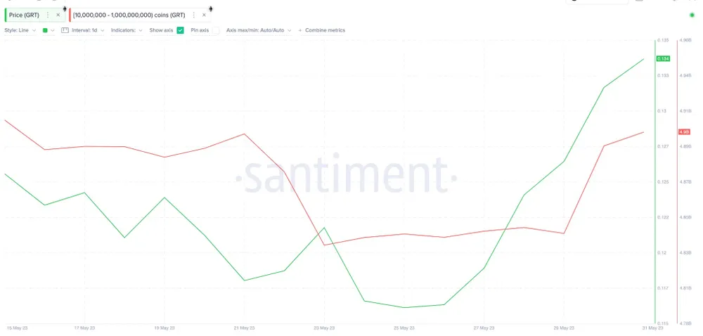 Từ ngày 23-5 đến ngày 31-5, cá voi nắm giữ số dư từ 10 triệu đến 1 tỷ token GRT đã thêm 70 triệu GRT vào tài sản nắm giữ của họ.