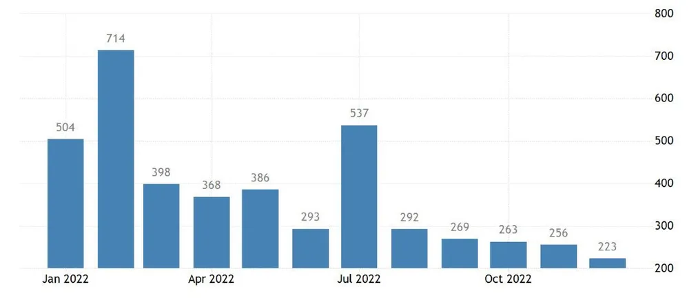 Sau khi điều chỉnh giảm từ mức 256.000 đạt được vào tháng 11-2022 và vượt dự báo của thị trường là 200.000, nền kinh tế Hoa Kỳ đã tạo thêm 223.000 việc làm vào tháng 12-2022, mức thấp nhất kể từ tháng 12-2020. Tổng số việc làm được nhận lương tăng 4,5 triệu vào năm 2022, tức trung bình 375.000 mỗi tháng, so với 562.000 vào năm 2021 và 168.000 vào năm 2019.