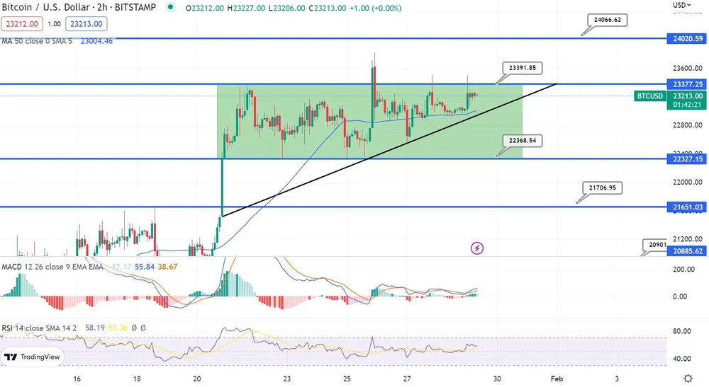 Triển vọng kỹ thuật của Bitcoin gần đây không thay đổi đáng kể khi nó tiếp tục giao dịch trong phạm vi hẹp giữa 22.900 USD và 23.400 USD. Nếu giá trượt dưới 22.900 USD, thị trường có thể sẽ theo xu hướng giảm, có khả năng sâu tới 22.400 USD.