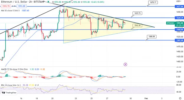 Trong biểu đồ 4 giờ, ETH được giao dịch nhấp nhô, chủ yếu dưới mức 1.600 USD. Đóng nến dưới mức này có khả năng tăng áp lực giảm giá. Ngoài ra, ETH đang hình thành mô hình tam giác đối xứng, cho thấy sự do dự của các nhà đầu tư.