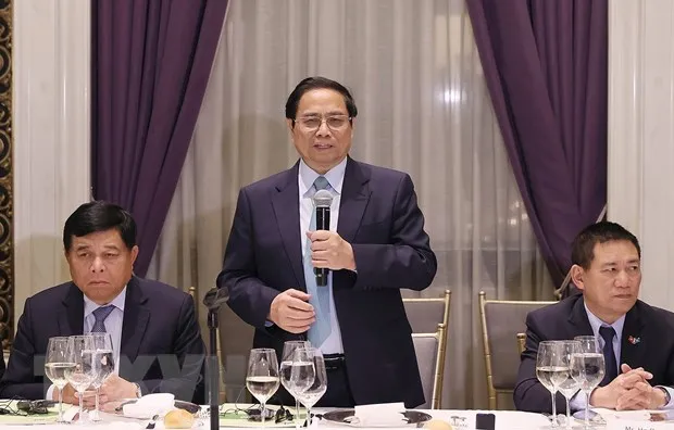 Thủ tướng Phạm Minh Chính phát biểu tại cuộc làm việc với các Quỹ đầu tư tài chính của Hoa Kỳ. (Ảnh: Dương Giang/TTXVN)