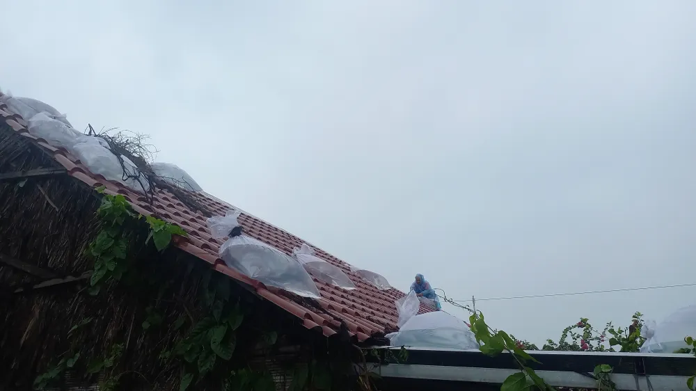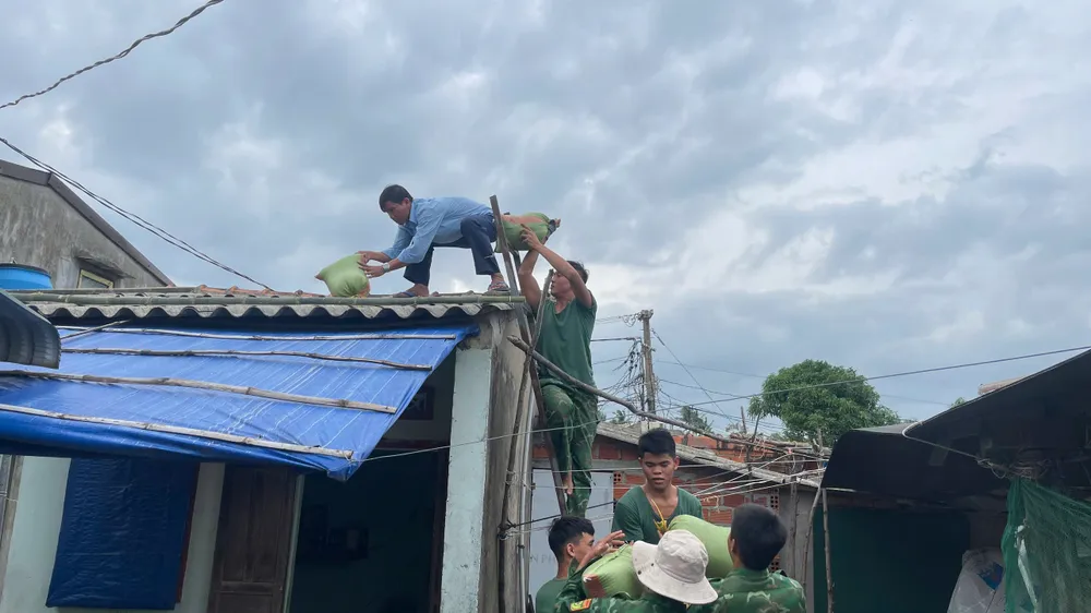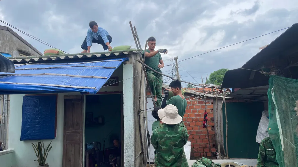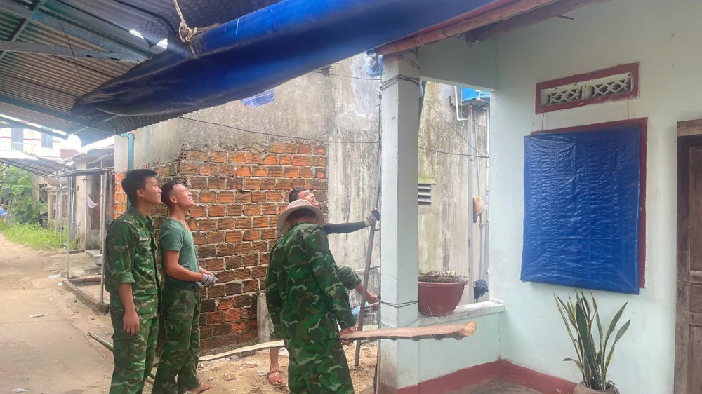 Ngay từ sáng sớm, cán bộ, chiến sĩ Đồn Biên phòng Bình Hải và Đồn Biên phòng cửa khẩu cảng Dung Quất đã sử dụng bao cát gia cố mái, chằng chống nhà cửa cho nhiều hộ dân khu vực ven biển, nơi có nguy cơ bị ảnh hưởng của bão số 6.