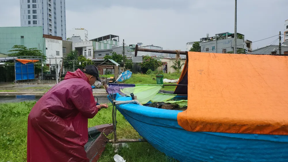 Tại đường lên bán đảo Sơn Trà, nhiều ngư dân đang gấp rút chằng dây buộc cố định, dùng bạt bao phủ che chắn cho những con thuyền đã được cẩu lên bờ. Một số ngư dân đang lấy tất cả phương tiện có giá trị như lưới, mái chèo… mang về nhà để bảo vệ.