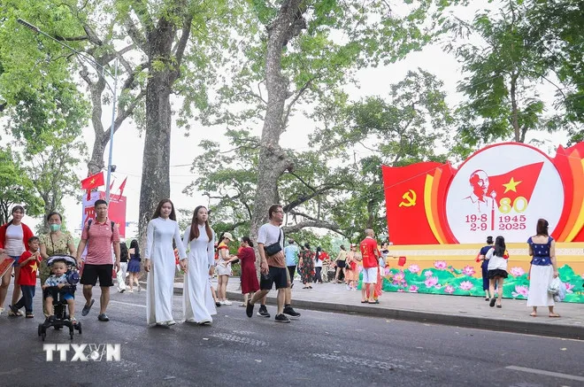 Du khách vui chơi tại khu vực phố đi bộ hồ Hoàn Kiếm. (Ảnh: Thành Phương/TTXVN)