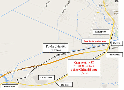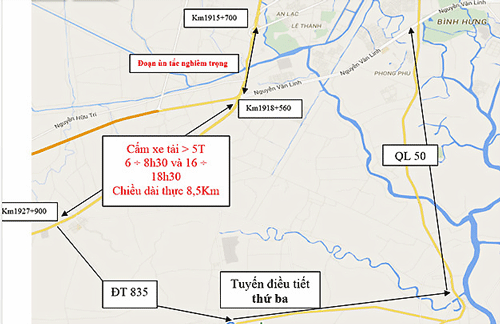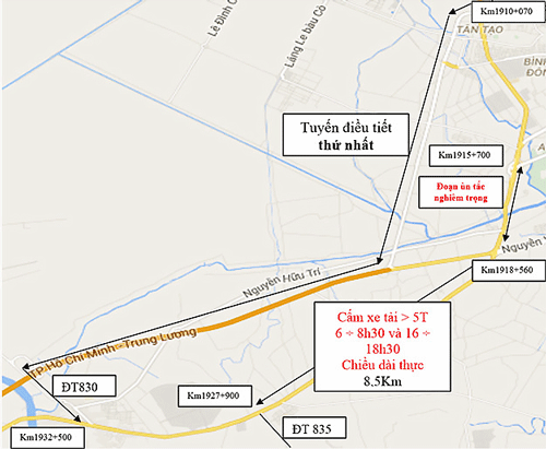 1- Cấm xe tải trên 5 tấn lưu thông trên quốc lộ 1 đoạn từ nút giao Bình Thuận, huyện Bình Chánh - TP.HCM (giao lộ đường Nguyễn Văn Linh và đường dẫn vào đường cao tốc) đến giao lộ quốc lộ 1 với đường DT 835, Long An