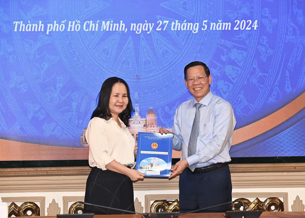 Chủ tịch UBND TPHCM Phan Văn Mãi trao quyết định đến bà Nguyễn Thị Hồng Diễm nghỉ hưu. Ảnh: VIỆT DŨNG