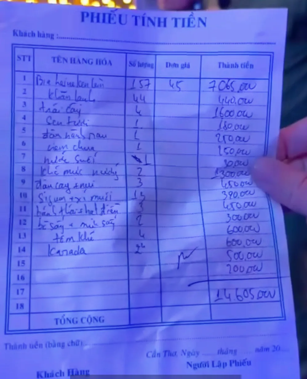 Đến khoảng 23 giờ 30 phút cùng ngày, khách kêu tính tiền và quán đưa phiếu với tổng số tiền cần thanh toán là 14.605.000 đồng. Trong khi hầu hết các thành viên trong nhóm khách đều đồng ý với giá dịch vụ trên, chỉ 1 khách tên N.Q.D. (ngụ xã Mong Thọ, huyện Châu Thành, tỉnh Kiên Giang) không đồng ý, cho rằng quán thu giá cao và quay clip phát tán lên mạng xã hội.