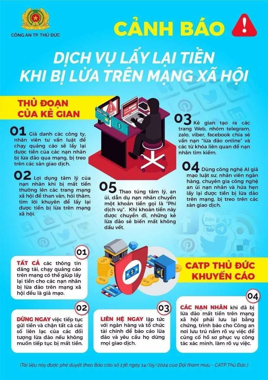 Ngày 14/5, Công an thành phố Thủ Đức, Thành phố Hồ Chí Minh phát đi thông báo tất cả các thông tin đăng tải, chạy quảng cáo trên mạng có thể giúp lấy lại tiền khi bị lừa đảo trên mạng xã hội đều là giả mạo.