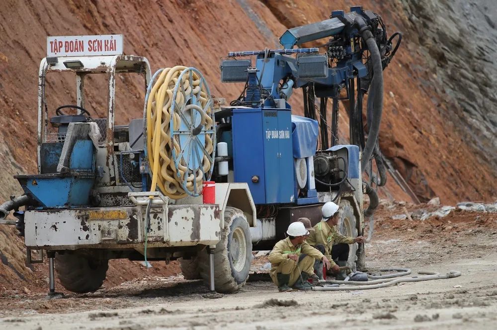Công nhân đang đưa mũi khoan vào sâu lòng núi, mở hầm số 3 (thuộc gói thầu XL03) cao tốc Bắc - Nam phía Đông, đoạn qua tỉnh Quảng Ngãi