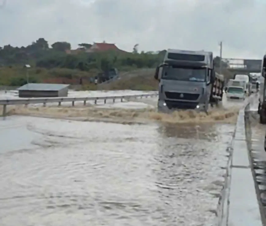 Mưa lớn kéo dài khiến đường cao tốc Phan Thiết - Dầu Giây qua tỉnh Lâm Đồng bị ngập sâu, giao thông gián đoạn.