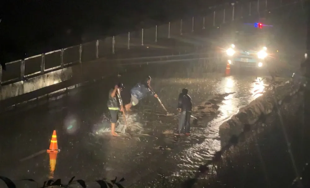 Nước mưa kèm cát bất ngờ đổ xuống đoạn tuyến đường cao tốc Vĩnh Hảo - Phan Thiết gây ngập úng cục bộ