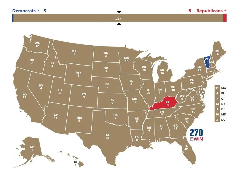 Donald Trump thắng ở Kentucky (8 phiếu đại cử tri) trong khi Biden thắng ở Vermont (3 phiếu đại cử tri) khi các cuộc thăm dò bắt đầu kết thúc.