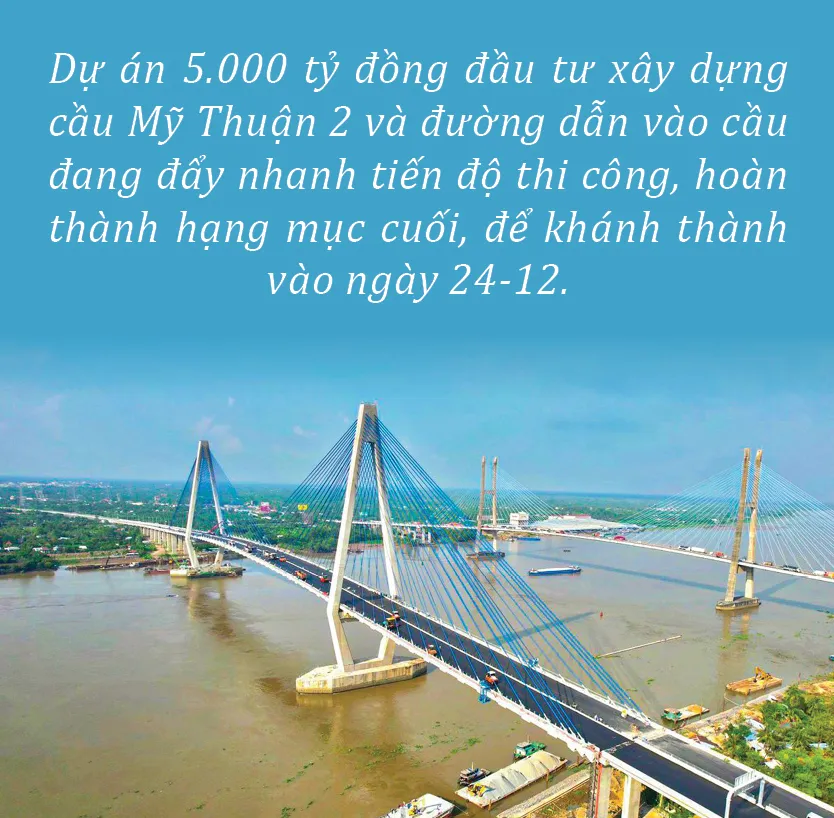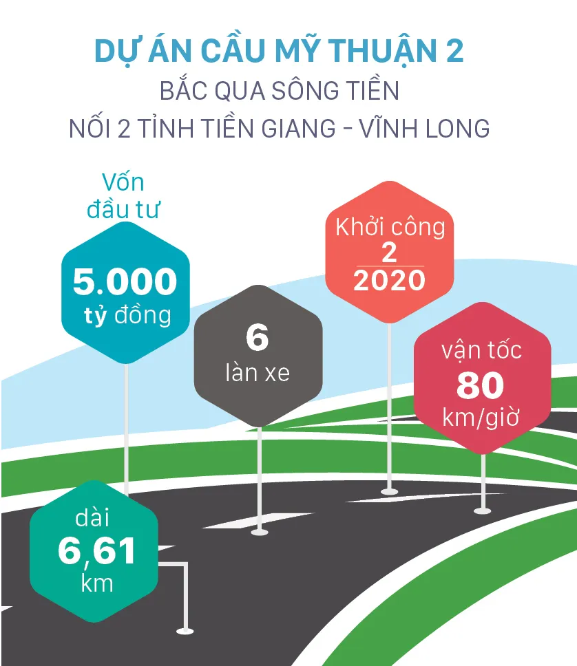 Dự án cầu Mỹ Thuận 2 bắc qua sông Tiền nối 2 tỉnh Tiền Giang - Vĩnh Long dài 6,61km, có vốn đầu tư 5.000 tỷ đồng, khởi công vào tháng 2-2020. Công trình có điểm đầu nối dự án cao tốc Trung Lương - Mỹ Thuận, điểm cuối kết nối cao tốc Mỹ Thuận - Cần Thơ. Trong đó, cầu chính dài hơn 1,9km, được đầu tư hoàn chỉnh 6 làn xe, vận tốc thiết kế 80km/giờ.