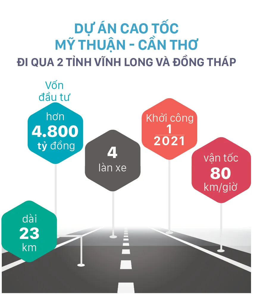 Theo thiết kế, cao tốc Mỹ Thuận - Cần Thơ dài 23km, đi qua 2 tỉnh Vĩnh Long và Đồng Tháp, tổng mức đầu tư hơn 4.800 tỷ đồng. Dự án khởi công tháng 1-2021, do Ban quản lý dự án Mỹ Thuận (Bộ GTVT) làm đại diện chủ đầu tư.