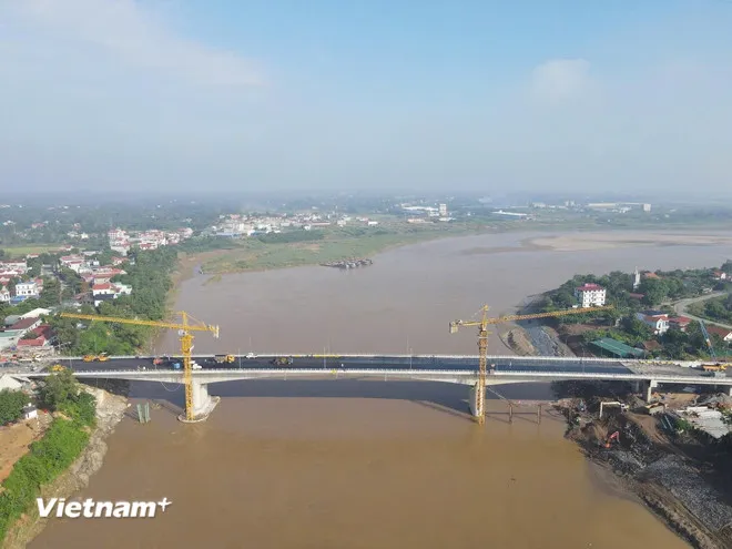 Cầu Phong Châu mới có tổng thời gian thi công cầu thực tế chỉ là 9 tháng và 7 ngày, thay vì 1,5-2 năm như nhiều công trình tương tự. (Ảnh: Việt Hùng/Vietnam+)