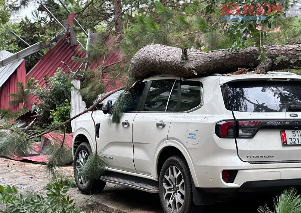 Cách đó khoảng 20m, một nhánh cây thông ba lá khác đường kính khoảng 40cm bị gãy rơi từ trên cao xuống cũng làm hư hỏng xe ô tô loại 7 chỗ ngồi.