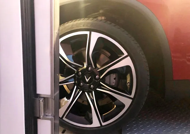 Logo VinFast được lồng ghép tinh tế vào lazang của xe. Bánh xe có kích thước lớn tạo độ bảnh và bám đường tốt.