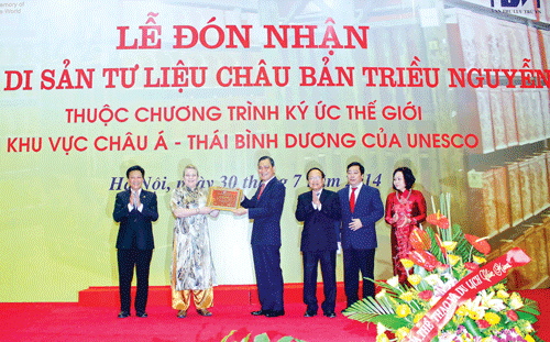 Sáng 30-7, lễ đón nhận bằng Di sản tư liệu Châu bản triều Nguyễn thuộc Chương trình Ký ức thế giới khu vực châu Á-Thái Bình Dương của UNESCO được tổ chức tại Hà Nội (ảnh). Đến thời điểm này, Châu bản triều Nguyễn là di sản tư liệu thứ 4 của Việt Nam được UNESCO công nhận sau Mộc bản triều Nguyễn (năm 2009), 82 bia đá Tiến sĩ tại Văn Miếu-Quốc Tử Giám (2010) và Mộc bản chùa Vĩnh Nghiêm (năm 2012).