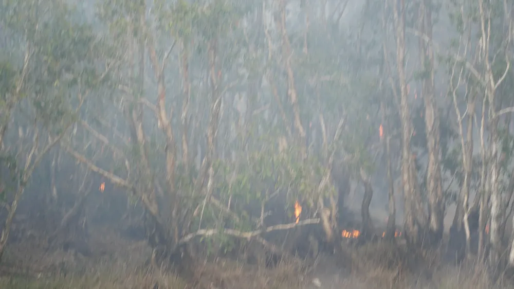Cột khói từ đám cháy rừng bốc cao hàng chục mét, tỏa ra cả một khu vực lớn. “Khói mù mịt tràn ra đường kèm bụi than che khuất tầm nhìn trên Tỉnh lộ 843 kéo dài khoảng 1km, dòng xe ùn ứ, nhiều ôtô phải dừng lại, một số tài xế bật đèn cảnh báo, cho xe chạy chậm”, một tài xế xe tải lỡ đường cho biết.