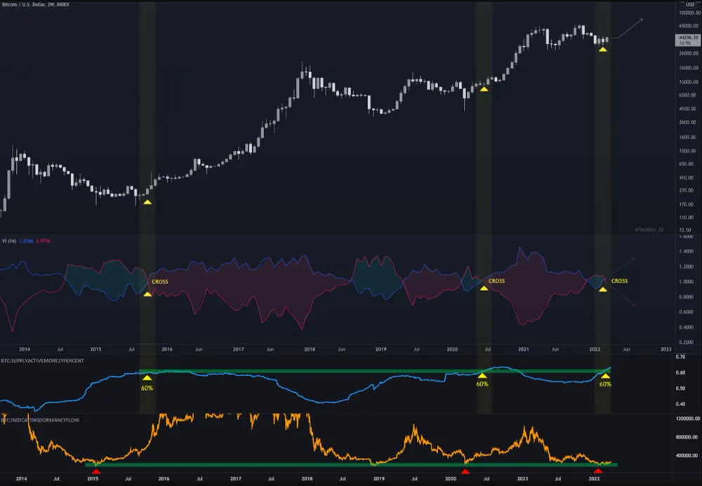Trong một tweet, nhà phân tích Tech Dev chia sẻ biểu đồ 3 tuần của Bitcoin và chỉ báo vortex (VI), một chỉ báo xác định sự đảo ngược xu hướng cho bất kỳ tài sản nào.