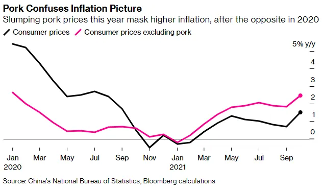 Nhìn chung, giá thực phẩm tiếp tục giảm vì tác động của thịt lợn, nhưng ở mức chậm hơn so với tháng 9/2021. Tuy nhiên, lạm phát lõi – loại trừ thực phẩm và năng lượng – chỉ tăng nhẹ lên 1.3%, cho thấy nhu cầu vẫn đang thấp.