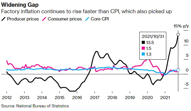 Giá sản xuất tại Trung Quốc tăng nhanh chóng trong vài tháng qua, đầu tiên là vì đà leo dốc của giá hàng hóa toàn cầu và sau đó là các đợt kiểm soát sản xuất vì thiếu điện. Lạm phát tiêu dùng cũng bắt đầu tăng khi vấn đề nguồn cung vì thời tiết bất lợi thúc đẩy giá thực phẩm và các nhà sản xuất chuyển chi phí cho tới các nhà bán lẻ.