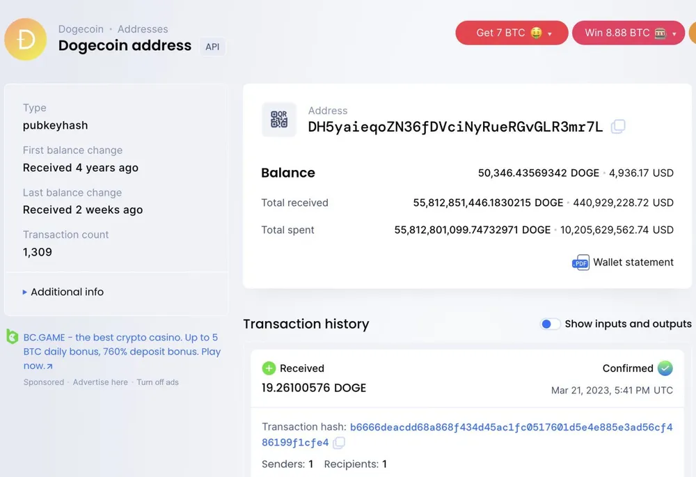Ví có tên “DH5ya”, được tạo ra vào năm 2019 và được báo cáo là đã nắm giữ một lượng lớn DOGE cho đến tháng 5-2021. Trong một vụ kiện tập thể cáo buộc Elon Musk “thao túng thị trường” DOGE, các nguyên đơn cho rằng ông chủ mới Elon Musk của Twitter đứng sau chiếc ví này.
