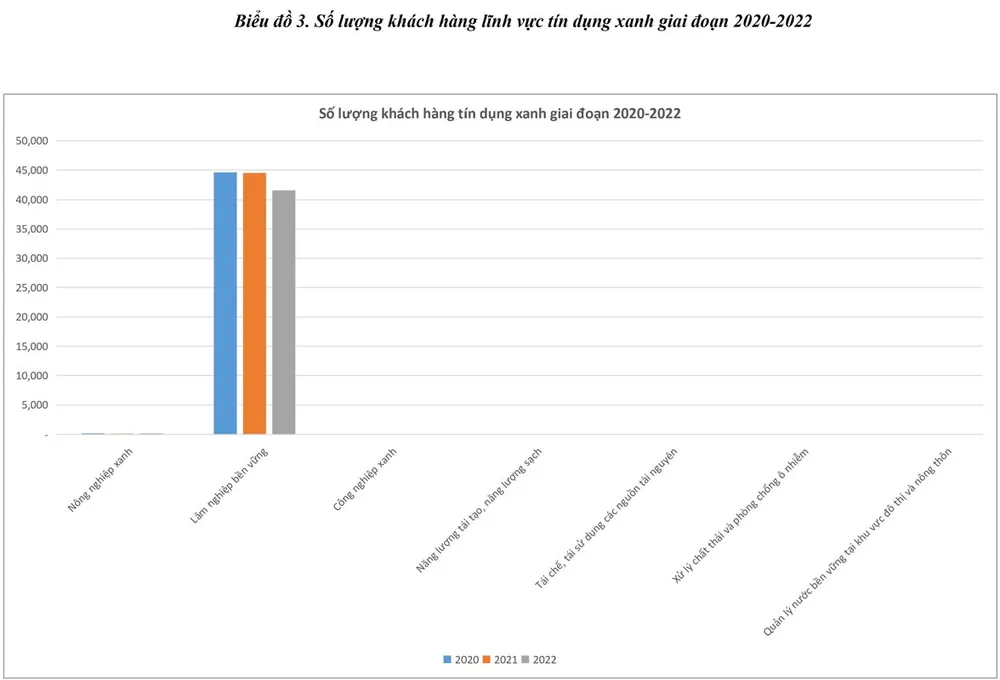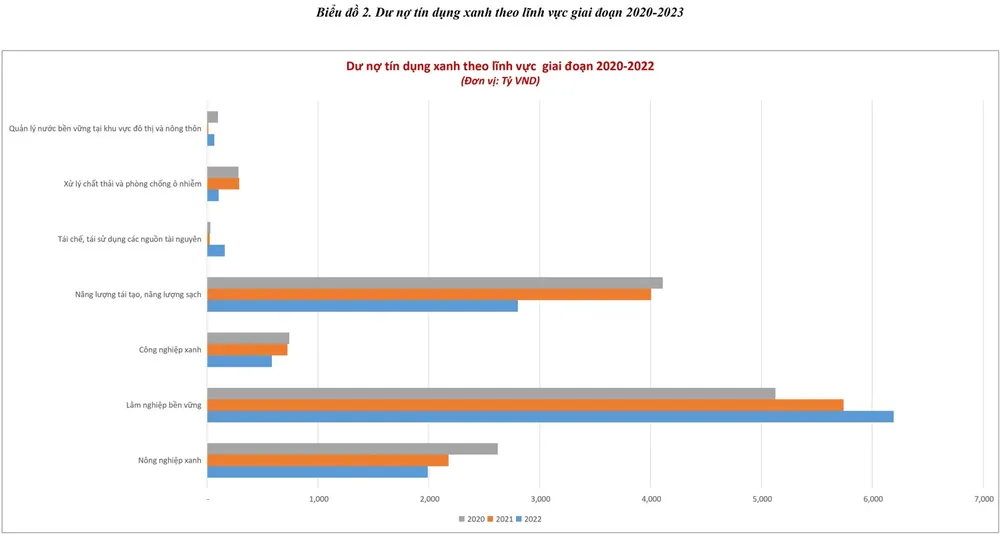 Đến 31-12-2022, dư nợ cho vay đối với lĩnh vực xanh tại Agribank đạt gần 12.000 tỷ đồng (chiếm khoảng 1% tổng dư nợ cho vay nền kinh tế), với hơn 41.000 khách hàng vay vốn. Trong đó, dư nợ lĩnh vực lâm nghiệp bền vững đạt 6.192 tỷ đồng, chiếm 52% tổng dư nợ tín dụng xanh, tăng 7,8% so với năm 2021; tiếp đến là lĩnh vực năng lượng tái tạo, năng lượng sạch với dư nợ đạt 2.803 tỷ đồng, chiếm 23,6% tổng dư nợ tín dụng xanh; và lĩnh vực nông nghiệp xanh với dư nợ 1.989 tỷ đồng, chiếm 16,7% tổng dư nợ tín dụng xanh.
