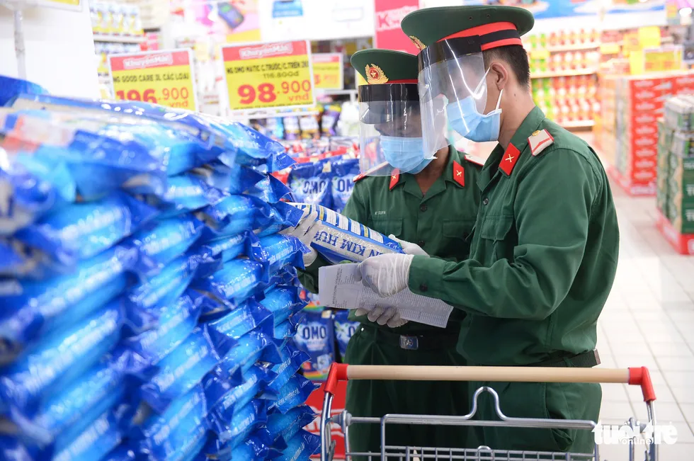 Tại các siêu thị, ngoài lực lượng nhân sự của các tổ công tác đặc biệt, còn có lực lượng quân nhân, chiến sĩ bộ đội cũng khẩn trương đi chợ hộ cho bà con.