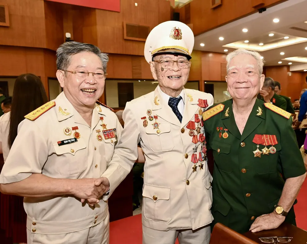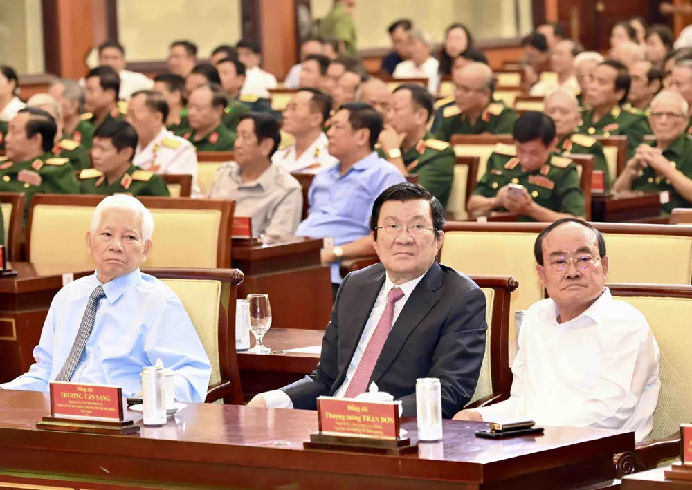 Từ trái qua: Nguyên Chủ tịch nước Nguyễn Minh Triết, nguyên Chủ tịch nước Trương Tấn Sang và Thượng tướng Trần Đơn, nguyên Thứ trưởng Bộ Quốc phòng dự chương trình họp mặt. Ảnh: VIỆT DŨNG