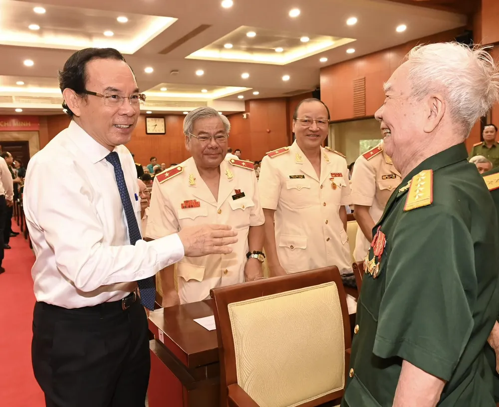 Bí thư Thành ủy TPHCM Nguyễn Văn Nên thăm hỏi và ôn lại truyền thống lịch sử với các tướng lĩnh quân đội và công an nghỉ hưu. Ảnh: VIỆT DŨNG