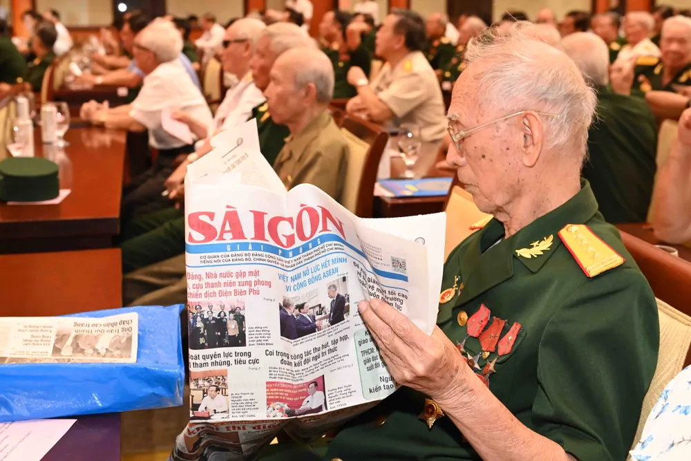 Đại biểu dự họp mặt đọc nhật báo Sài Gòn Giải Phóng trước khi chương trình họp mặt diễn ra. Ảnh: VIỆT DŨNG