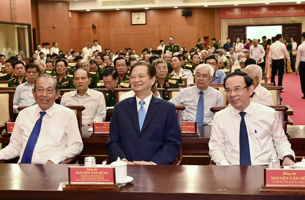 Từ trái qua: Nguyên Phó Thủ tướng Thường trực Trương Hòa Bình, Nguyên Thủ tướng Nguyễn Tấn Dũng và Bí thư Thành ủy TPHCM Nguyễn Văn Nên dự chương trình họp mặt. Ảnh: VIỆT DŨNG