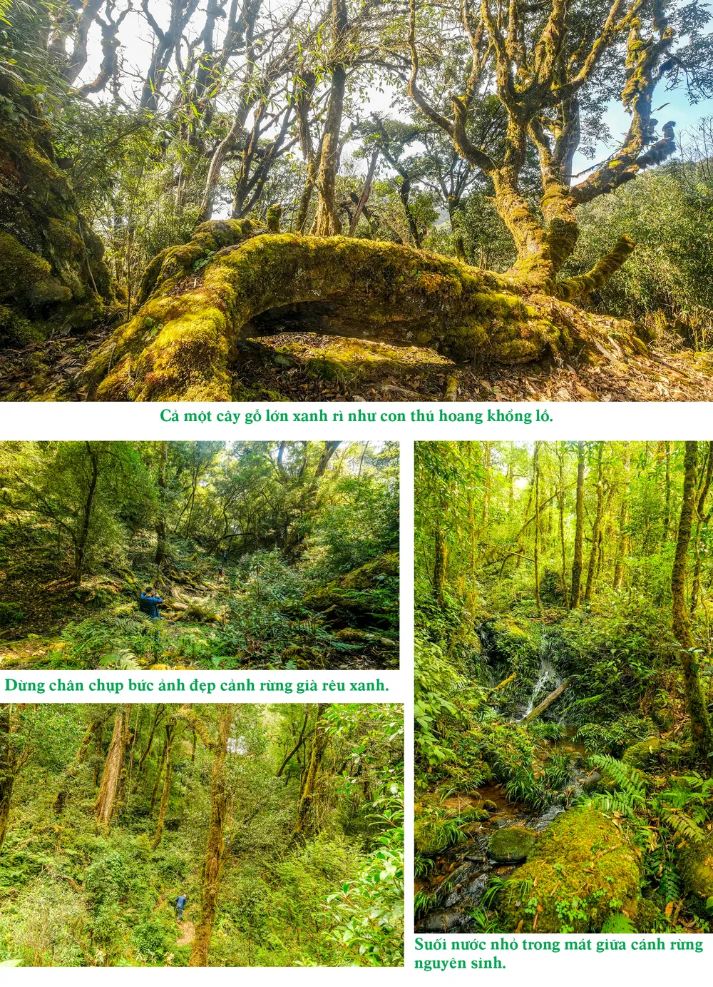 Càng tiến sâu vào khu rừng, mọi người cảm thấy như đang lạc vào một khu vườn rêu xanh, âm u huyền bí. Hàng ngàn thân cây cổ thụ, cây leo đều khoác lên mình tấm áo rêu cỏ xanh rì. Có đoạn cả một khu vực với vô số cây rêu tua tủa uốn éo như những con bạch tuộc khổng lồ đang vươn bộ xúc tu lên trời. Cảnh rừng khiến mọi người phải ngạc nhiên vì chưa được chiêm ngưỡng trong đời.