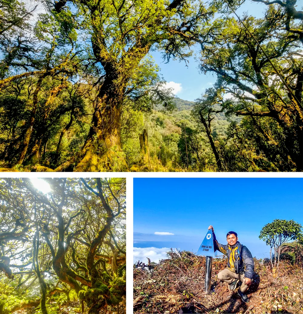 Sau khi vượt qua đoạn đường rậm rạp, mọi người đặt chân đến lưng chừng núi, những gốc cây cổ thụ lâu năm bắt đầu xuất hiện ngày một nhiều. Ở độ cao khoảng 2.000m trên mực nước biển, chúng tôi bắt đầu thích thú cảnh sắc rừng già nguyên sinh. Có đoạn ngổn ngang những thân gỗ mục bám đầy rêu xanh đổ sụp xuống nền đất.