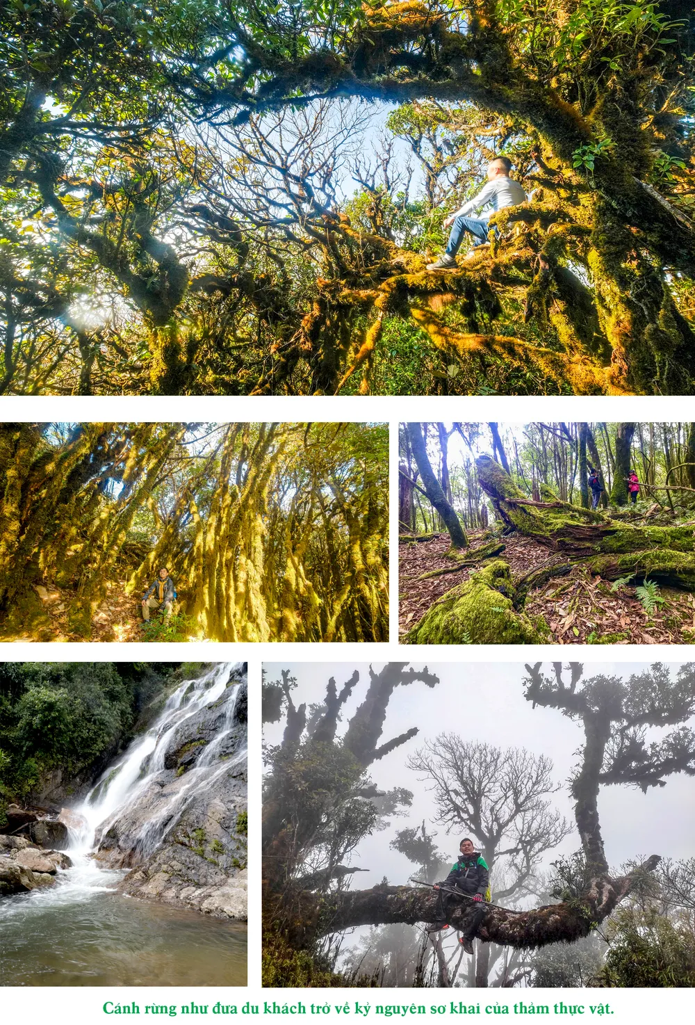 Cánh rừng như đưa du khách trở về kỷ nguyên sơ khai của thảm thực vật. Bên những gốc cây rêu cỏ thỉnh thoảng lại hiện ra vài nhánh phong lan, địa lan và các loài hoa không tên vô cùng đẹp mắt. Đi sang ngang hay men theo sườn dốc lên đỉnh núi, chúng tôi đều như không thoát được thế giới của loài rêu.