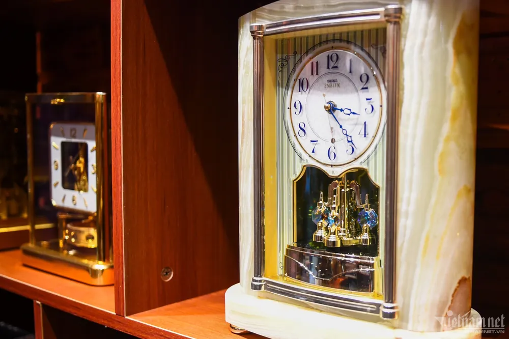 Nổi bật trong tủ bày hàng của anh Vui là chiếc đồng hồ Seiko Emblem (Nhật Bản), giá gần 10 triệu đồng, được làm từ đá cẩm thạch, bộ phận lắc xoay làm bằng pha lê “Swarovski".