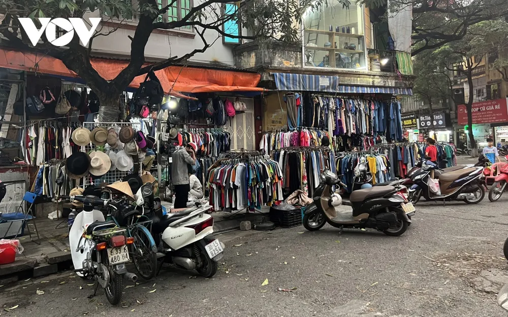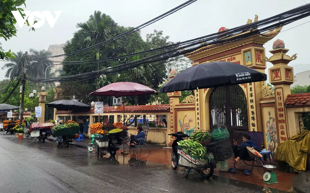 Trong khu vực làng Đại Từ (Hoàng Mai, Hà Nội), hàng quán bày bán dọc hai bên đường, khiến việc đi lại rất khó khăn, dù đang ở thời điểm vắng khách.