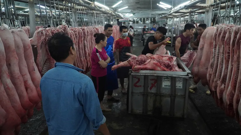 Thịt heo từ các tỉnh nhập về chợ đầu mối nông sản thực phẩm Hóc Môn, TPHCM Ảnh: ĐỨC TRUNG