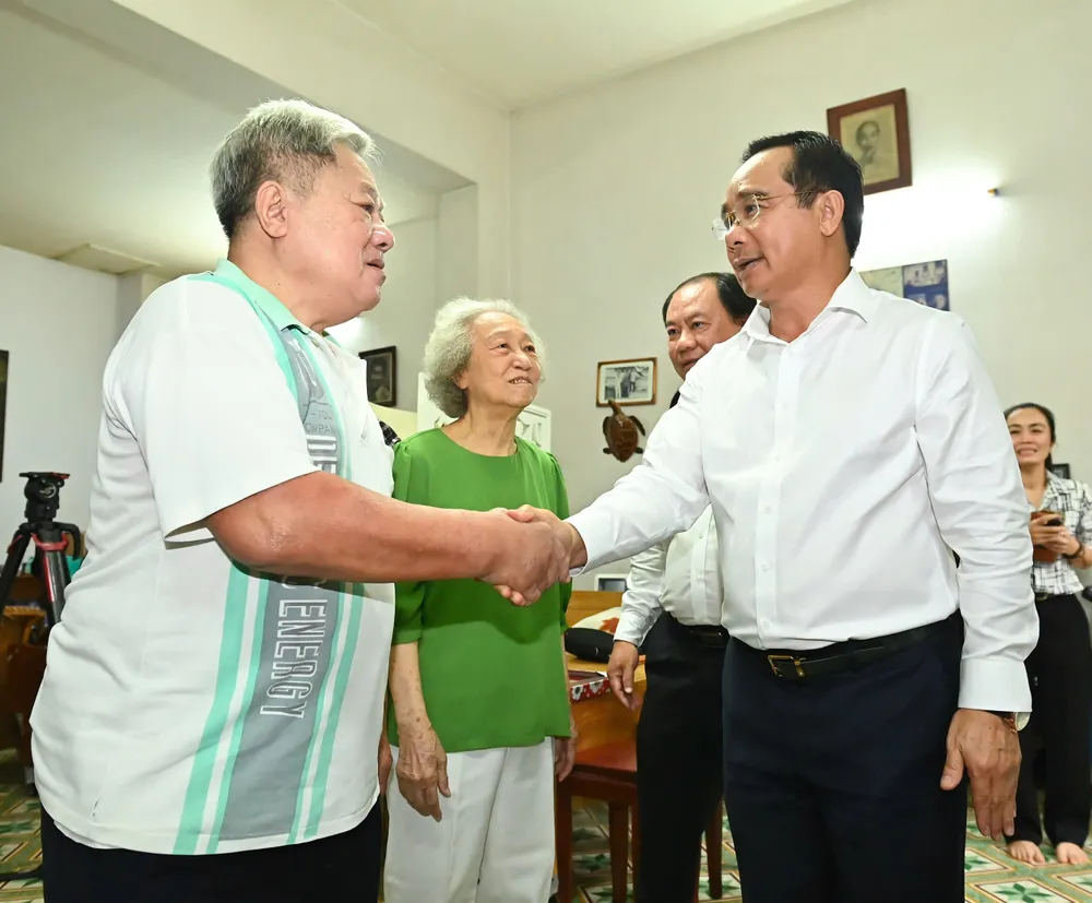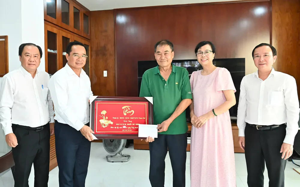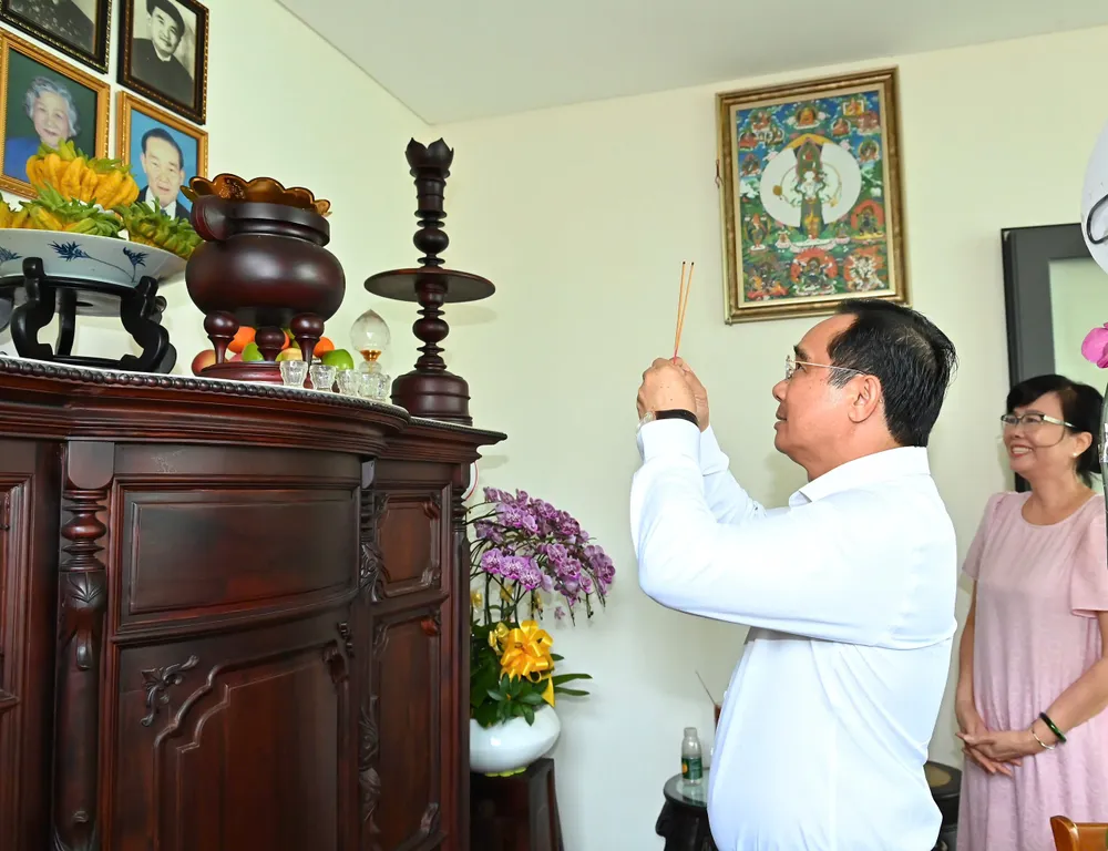 Tiếp đó, đoàn đến thăm gia đình Anh hùng lao động, Viện sĩ, Tiến sĩ, Dược sĩ Nguyễn Duy Cương, nguyên Thứ trưởng Bộ Y tế, nguyên Giám đốc Sở Y tế TPHCM. Tại đây, đồng chí Nguyễn Văn Được thành kính thắp nén nhang tri ân TS-DS Nguyễn Duy Cương. Đồng thời, đồng chí dành nhiều thời gian trò chuyện, động viên, tri ân gia đình TS-DS Nguyễn Duy Cương vì những đóng góp cho ngành y tế.