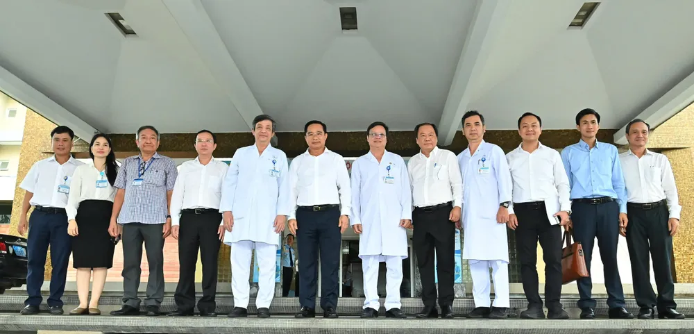 Chủ tịch UBND TPHCM cùng đoàn chụp hình lưu niệm với lãnh đạo Bệnh viện Thống Nhất. Ảnh: VIỆT DŨNG