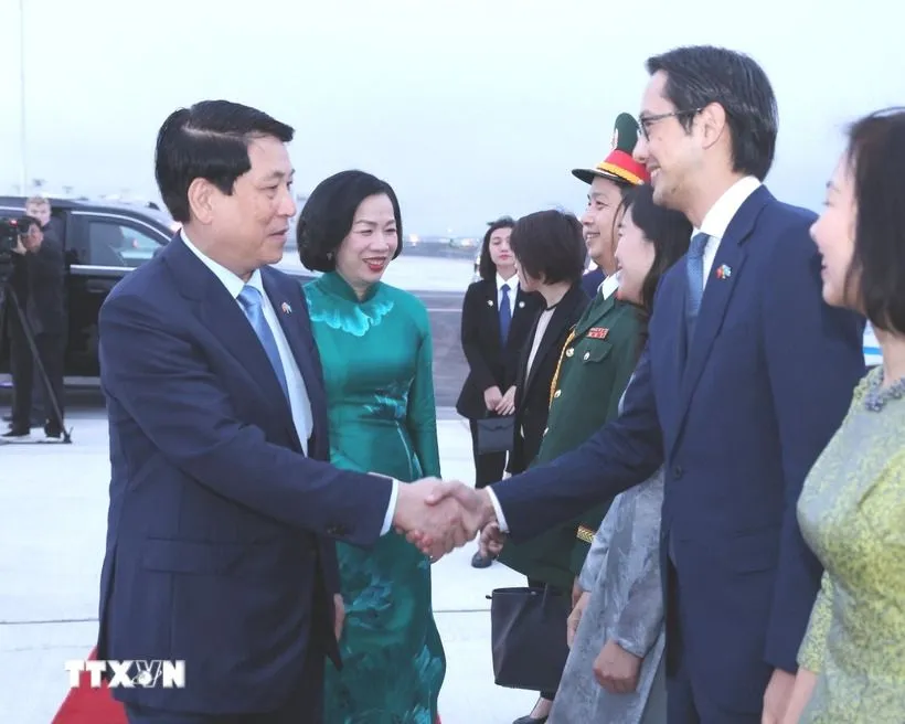 Đại sứ, Trưởng Phái đoàn Thường trực Việt Nam tại Liên hợp quốc Đỗ Hùng Việt tiễn Chủ tịch nước Lương Cường và Phu nhân tại sân bay John F. Kennedy, thành phố New York. Ảnh: TTXVN
