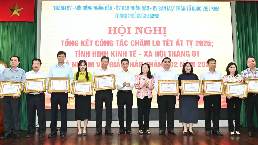 Chủ tịch HĐND TPHCM Nguyễn Thị Lệ cùng Phó Chủ tịch UBND TPHCM Nguyễn Văn Dũng trao Bằng khen của Chủ tịch UBND TPHCM đến các tập thể có thành tích xuất sắc trong công tác chăm lo Tết Nguyên đán 2025. Ảnh: VIỆT DŨNG