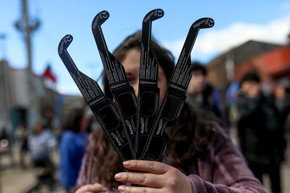 Một người phụ nữ đang phát kính ngắm nhật thực ở Coyhaique, Chile.